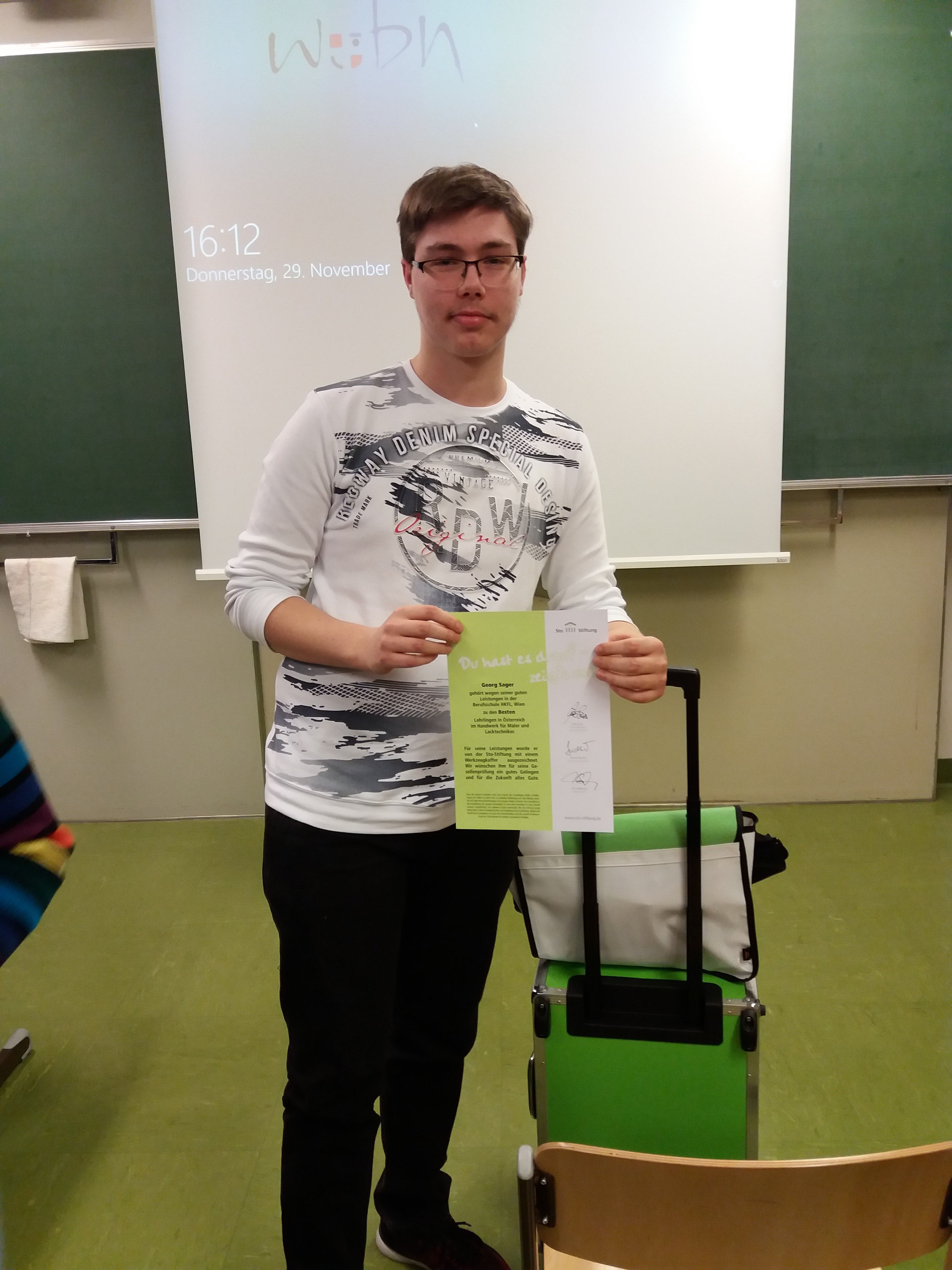 Georg Sager, der im September 2018 aus einer überbetrieblichen Ausbildungsstätte in die Firma Matejka OG Raumgestaltung wechselte und von der Berufsausbildungsassistenz von Jugend am Werk im Rahmen seiner Berufsausbildung mit verlängerter Lehrzeit unterstützt wird, wurde von der gemeinnützigen Sto-Stiftung als einer von fünf Lehrlingen ausgezeichnet. Für seine Leistungen erhielt er einen hochwertigen Werkzeugkoffer sowie eine Urkunde.