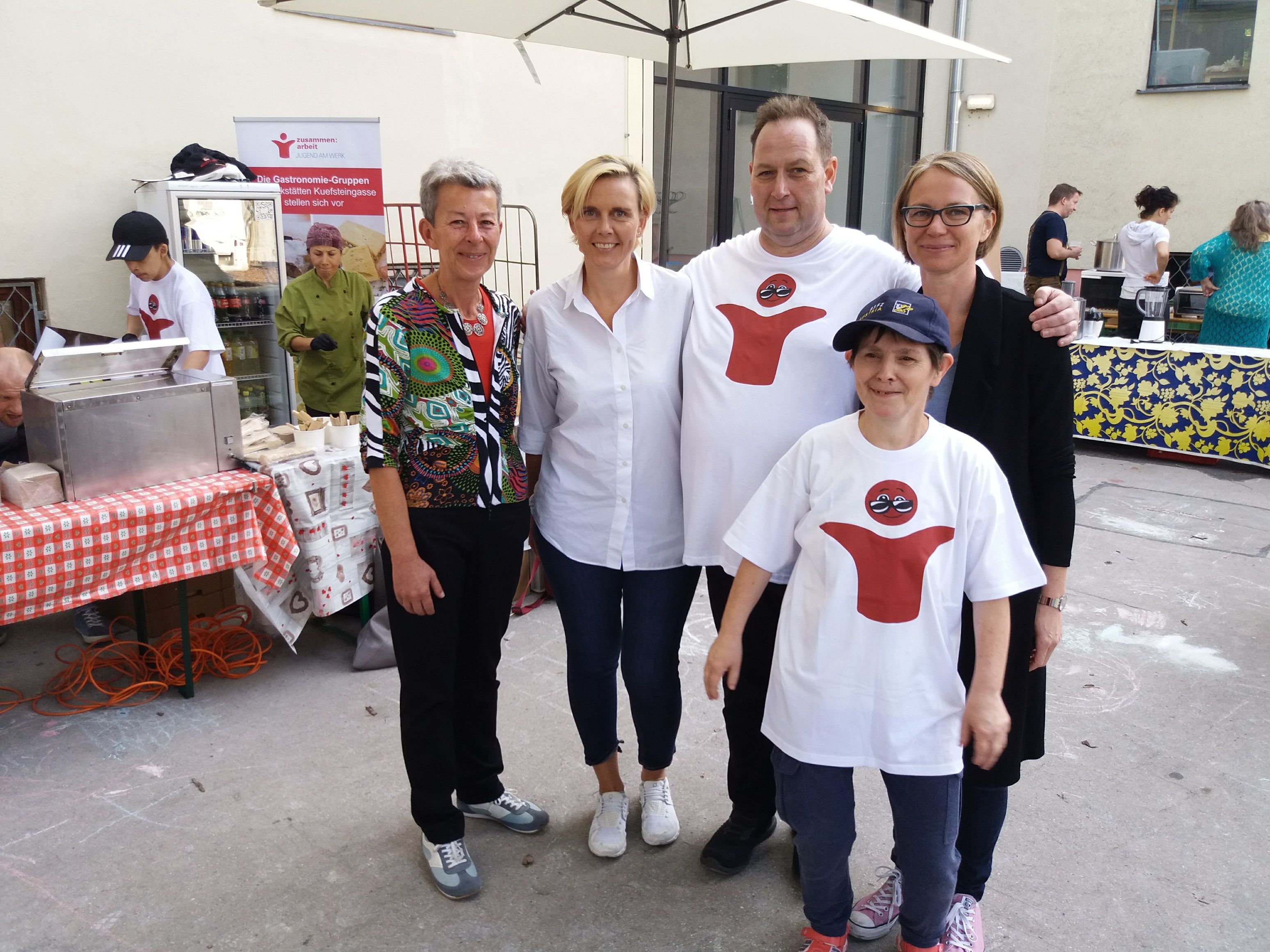 Rund um das Festzelt im Schulhof des Josefinums gab es Getränke und selbst gemachte Speisen, Informationsstände zu Jugend am Werk und anderen Organisationen sowie ein Shuttleservice zur Werkstätte Kuefsteingase, wo Hausführungen und kulinarische Schmankerl auf interessierte Gäste warteten. Die offizielle Eröffnung nahm die erst kürzlich gewählte Bezirksvorsteherin Michaela Schüchner vor und anschließend sorgten „Die Edlseer“ für ausgelassene Stimmung. Weitere Programmpunkte waren eine Tanzvorführung von „Happy Feet“, eine Stegreif-Gaunerkomödie der Theatergruppe Flip-Flap, die Premiere des Jubiläumsfilms der Werkstätte Kuefsteingasse sowie als Abschluss das Konzert der „Pittentaler Spitzbuam“. Es war ein gelungenes Fest – vielen Dank an alle Kolleginnen und Kollegen sowie Menschen mit Lernschwierigkeiten, die vor Ort und bei den Vorbereitungen mitgeholfen haben.