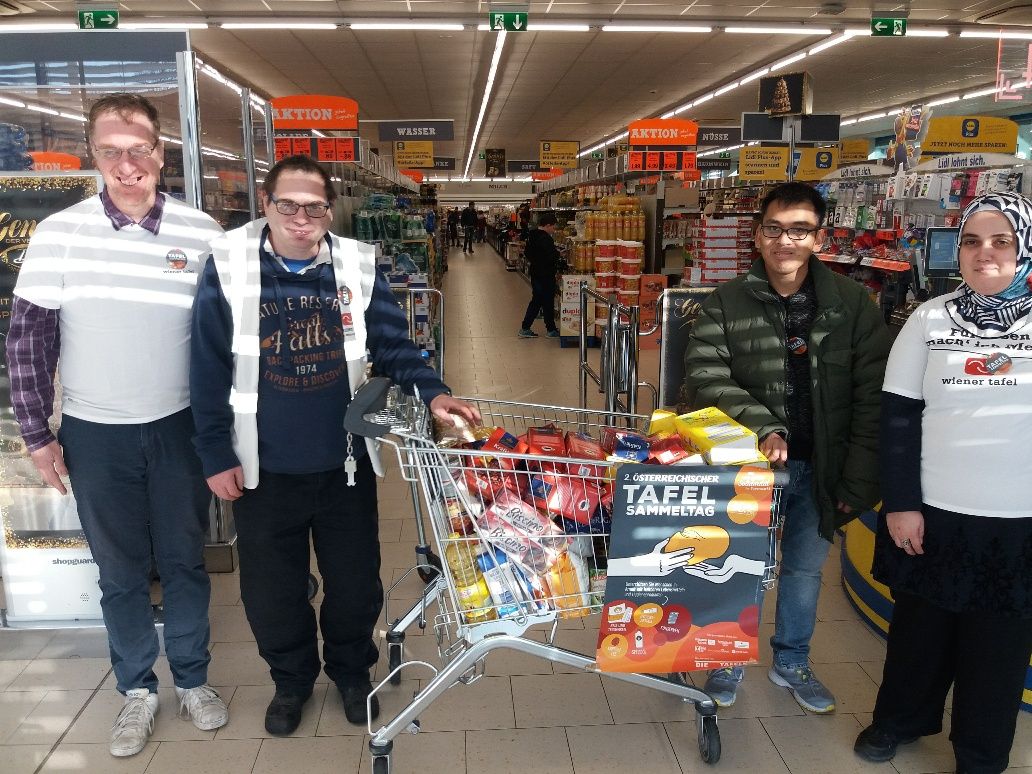 Aktiv beteiligt waren diesmal auch acht Menschen mit Lernschwierigkeiten und Behinderung aus vier Tagesstrukturen und dem Kompetenz-Zentrum (Regina Bubendorfer, Gerlinde Planinger, Wolgang Brader, Martin Eder, Rukije Masmas, Daniela Zihlarsch, Brigitte Hartmann und Christopher Manalo). Zusammen mit der Kollegin und dem Kollegen aus der praktischen Berufsorientierung wurden an diesem Tag in der Filiale Leberstraße, im 11. Bezirk 24 Kartons mit knapp 330 Kilogramm Lebensmittel gesammelt.