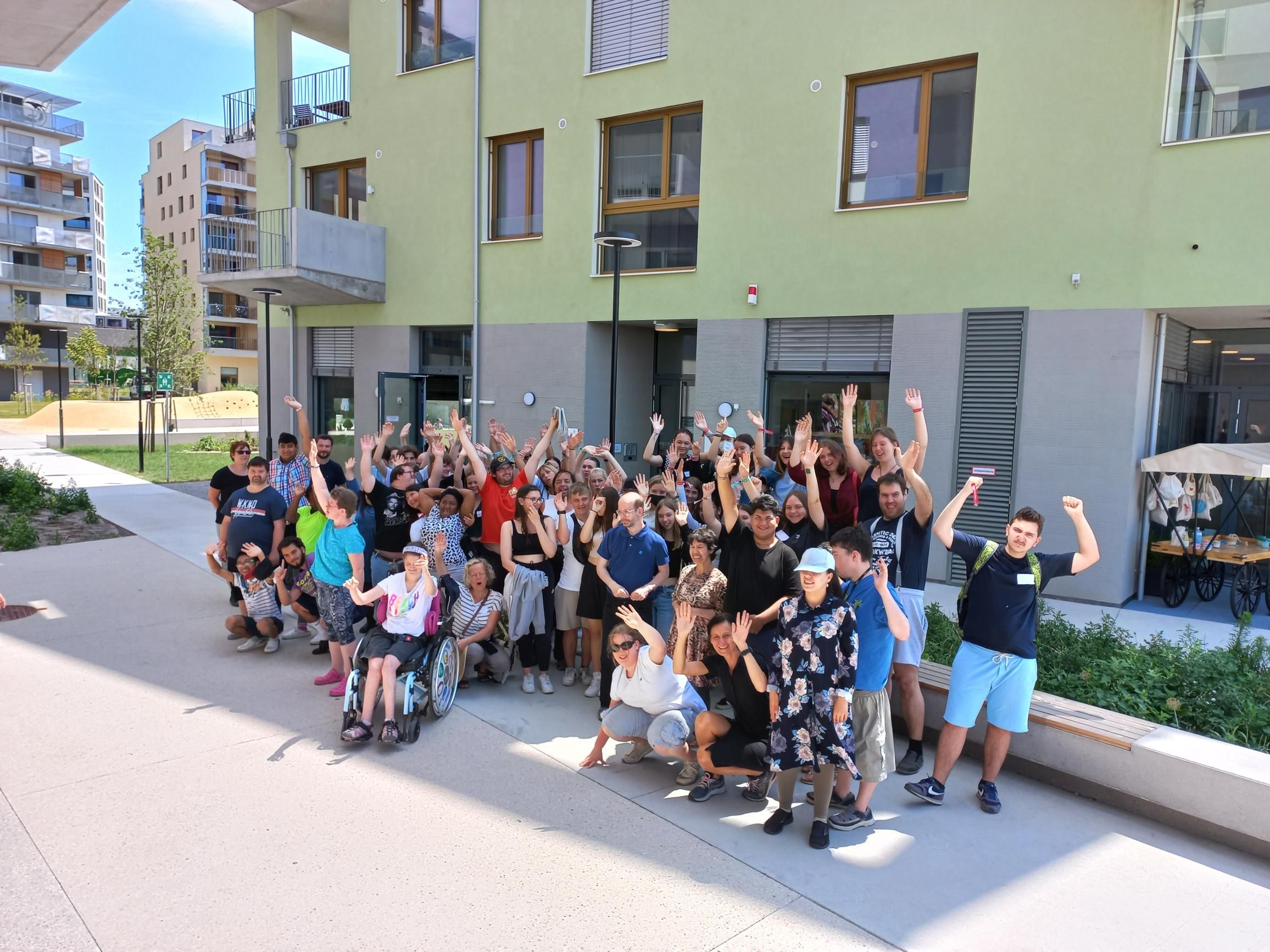 Eine Klasse aus der Neuen Mittelschule Singrienergasse am 23. Juni und eine Klasse aus dem Evangelischen Gymnasium am 24. Juni gestalteten jeweils ein Fest für die Tagesstruktur Grundsteingasse. Die Materialien wurden bereitgestellt und die Schüler/innen organisierten den Aufbau und betreuten die Stationen mit Boccia, Frisbeegolf, Stockschießen, Hockey, Wasserbombenweitwurf und Kegeln. Dazu gab es eine Kreativstation mit einer manuellen Fotobox, Armbändern und Seidenblumen, eine Spiel- und Musik Station mit Karaoke, Trommeln, Bingo, Glücksrad und Brettspielen und eine Gastro-Station, wo die Verpflegung gemeinsam mit Menschen mit Behinderung hergestellt und serviert wurde.