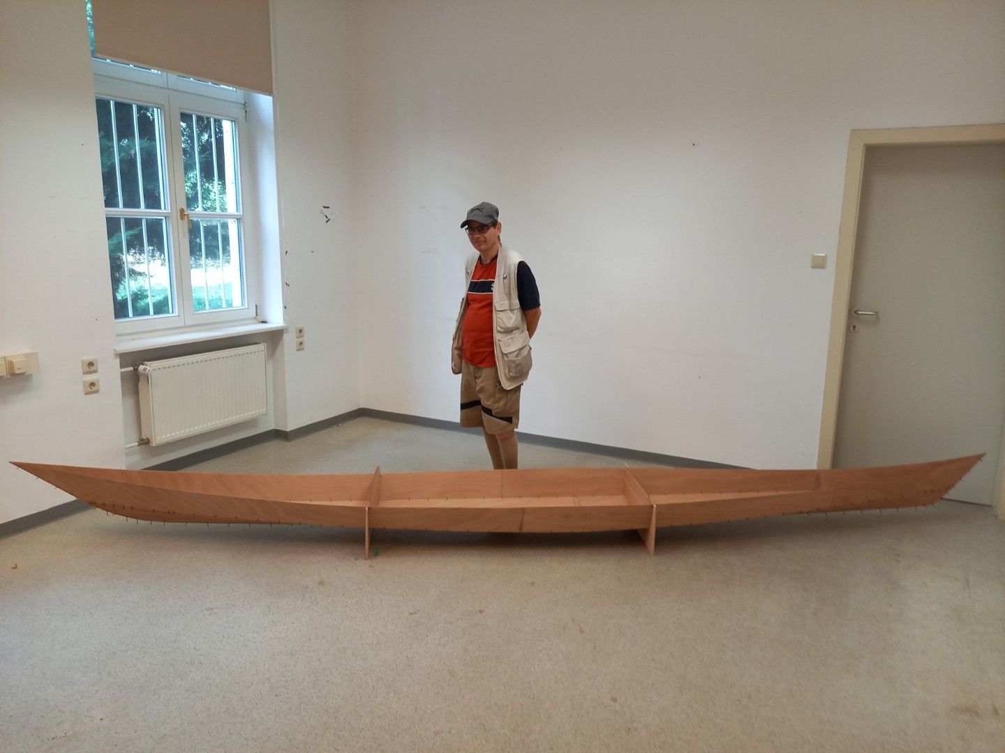 Herr Wolfgang Brader unterstützt einen Tischler, der ein Kajak selbst anfertigt.