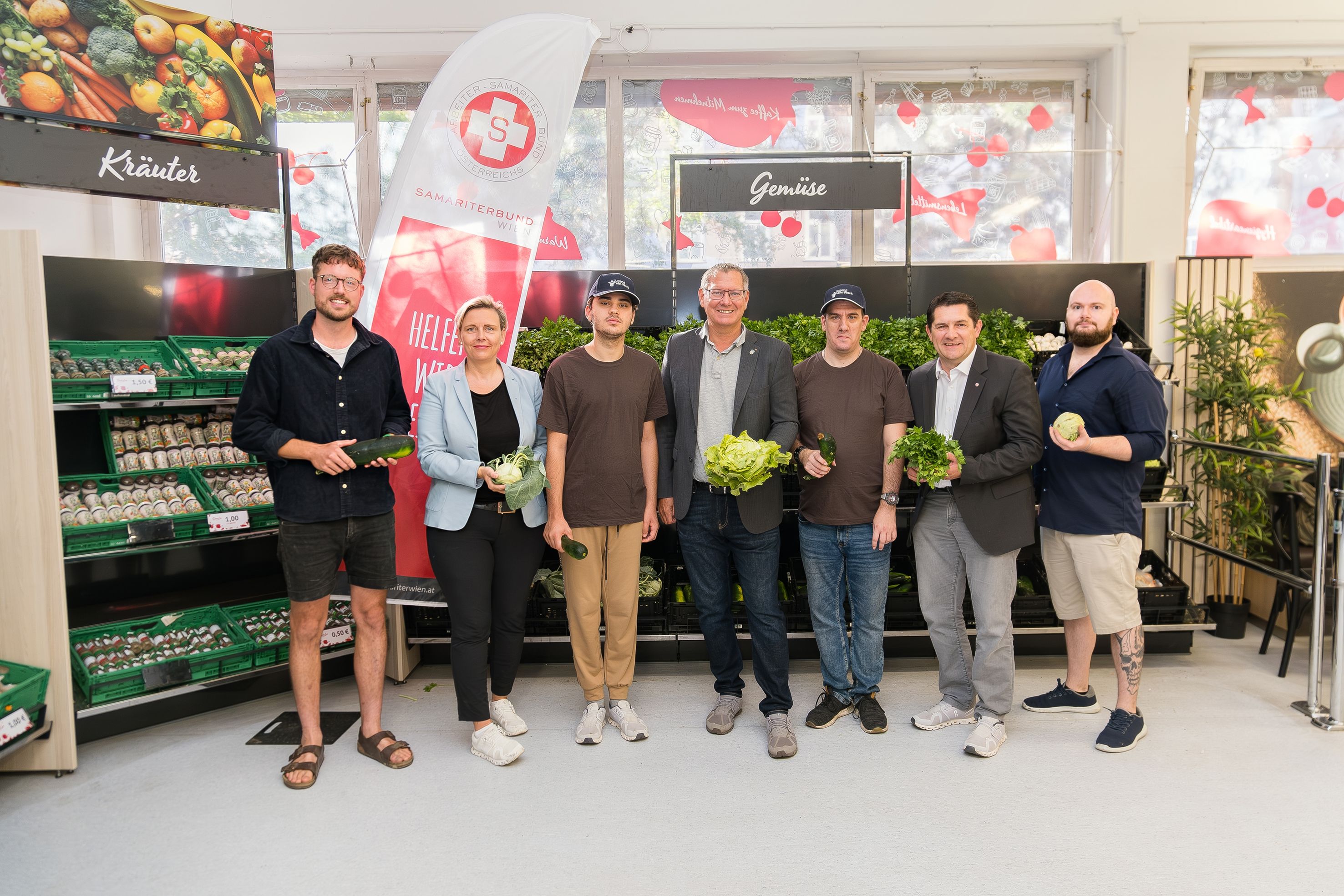 Bei einem gemeinsamen Fototermin am 5. August 2024 im Sozialmarkt des Samariterbundes Wien in Wien-Floridsdorf konnte sich auch der Bezirksvorsteher des 21. Bezirks, Georg Papai, persönlich von der Qualität des geernteten Gemüses von Held:innen am Werk überzeugen. Das Projekt Held:innen am Werk ist eine Kooperation zwischen Jugend am Werk, den ackerhelden und dem Samariterbund Wien. Auf einer Ackerfläche im 21. Bezirk wird ein Mal pro Woche Gemüse geerntet und dann vom Samariterbund abgeholt, um in Sozialmärkten der Umgebung sowie Häusern der Wohnungslosenhilfe und Flüchtlingshilfe an armutsbetroffene Menschen verteilt zu werden.