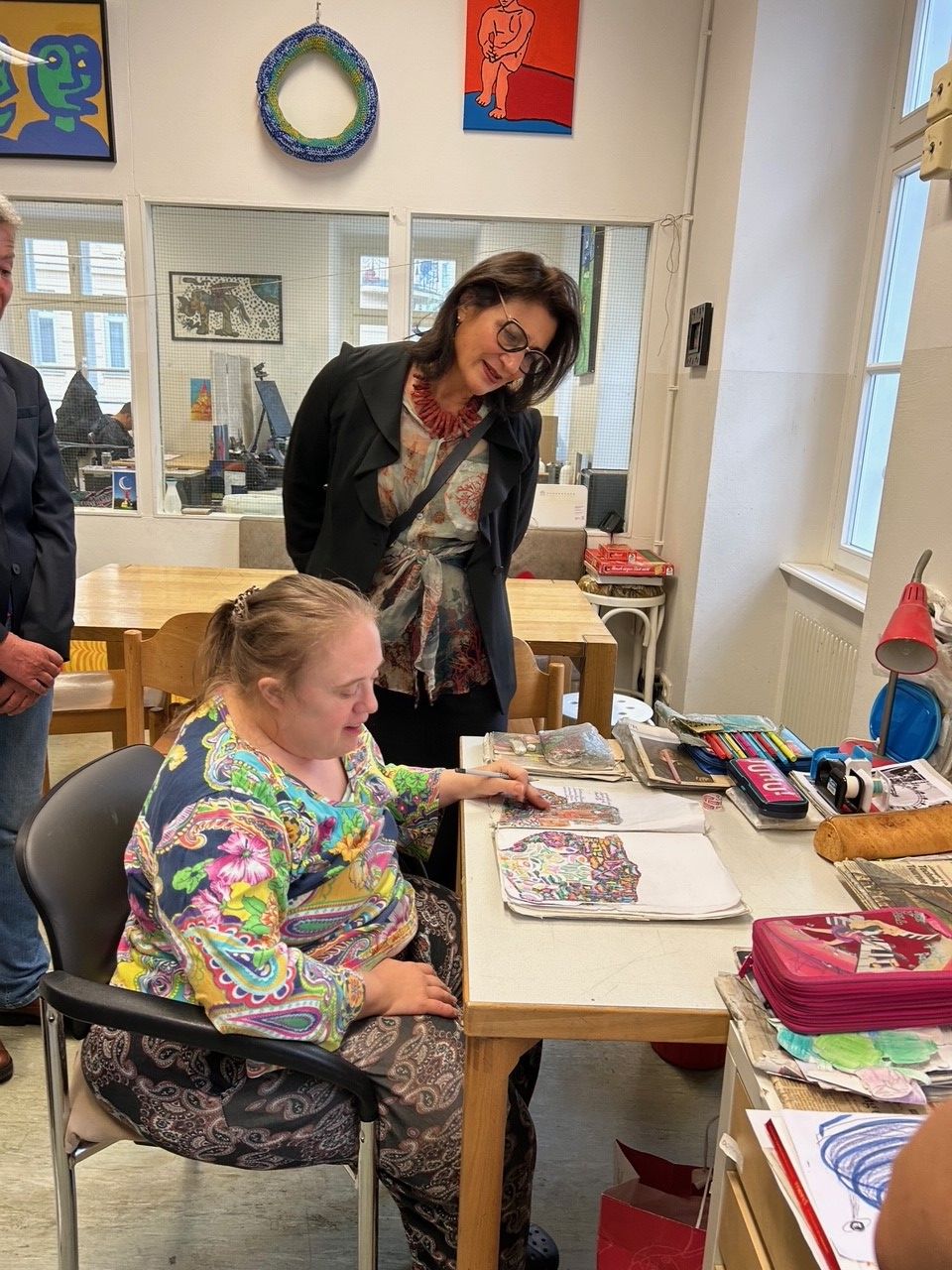 Bei Gesprächen mit den Künstler:innen mit Behinderung im Galeriecafe werd:art konnte Kulturstadträtin Kaup-Hasler einen Einblick in das künstlerische Schaffen gewinnen.
