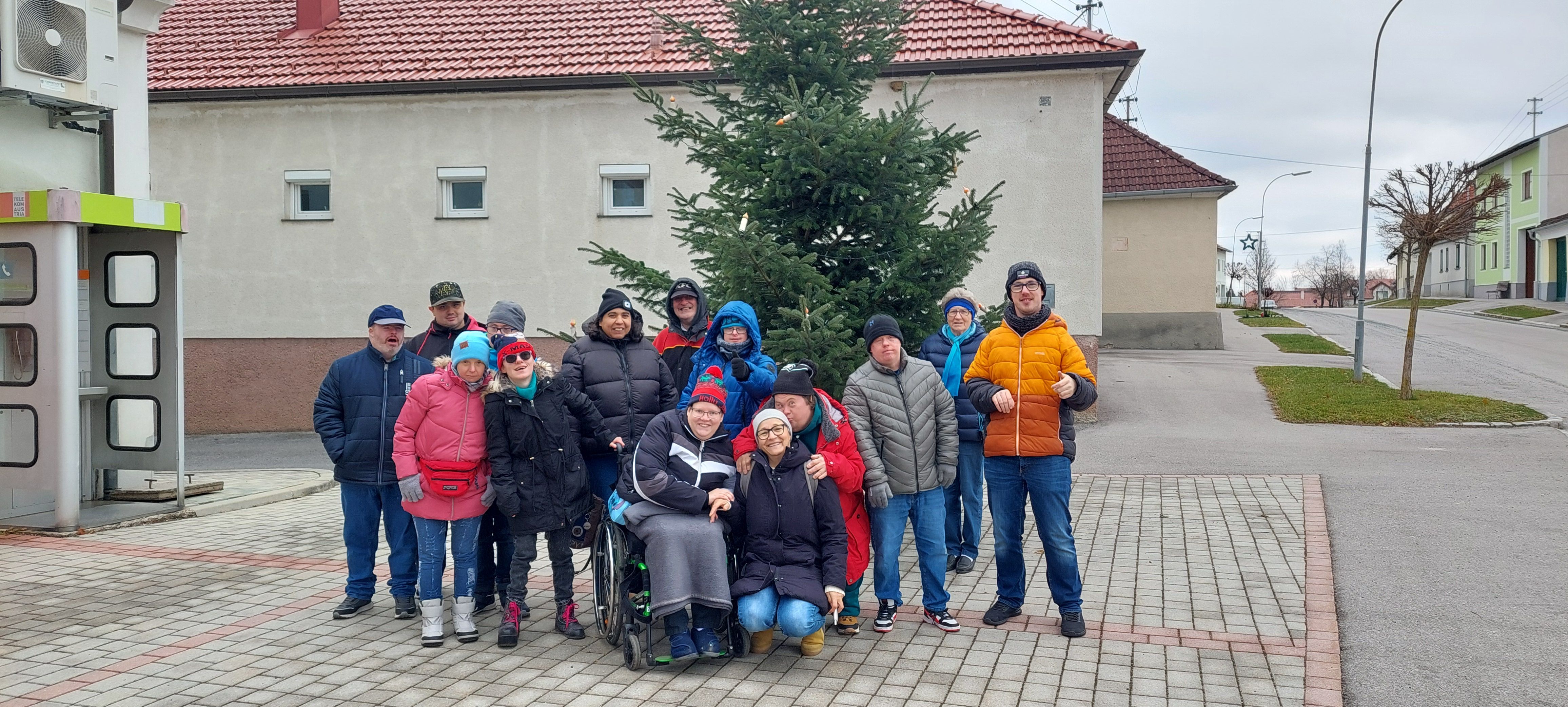 Eine Gruppe aus der Tagesstruktur Hirschstetten wurden von der Familie Grosinger aus Hochstraß im Burgenland auf ihr Weihnachtsbaumfeld eingeladen, um den Christbaum für ihre Gruppe selbst auszusuchen und vor Ort mit Herrn Grosinger zu fällen. Es dauerte einige Zeit, bis sich die Gruppe einig wurde und Herr Grosinger zur Tat schreiten konnte. Gemeinsam wurde der gefällte Christbaum durch ein Netz gezogen und zum Auto gebracht. Zwischendurch wurden alle von Frau Grosinger mit selbst gebackenen Weihnachtskeksen verwöhnt.