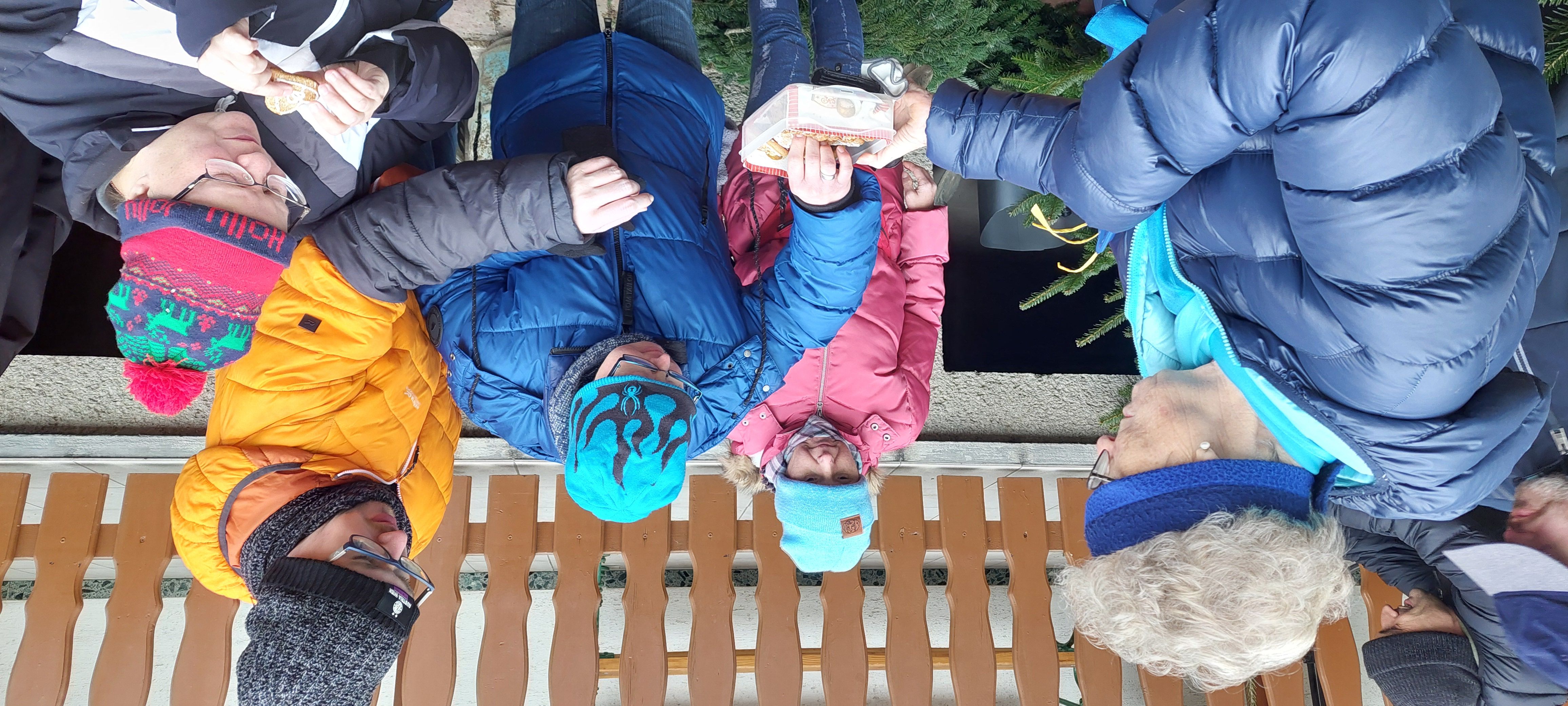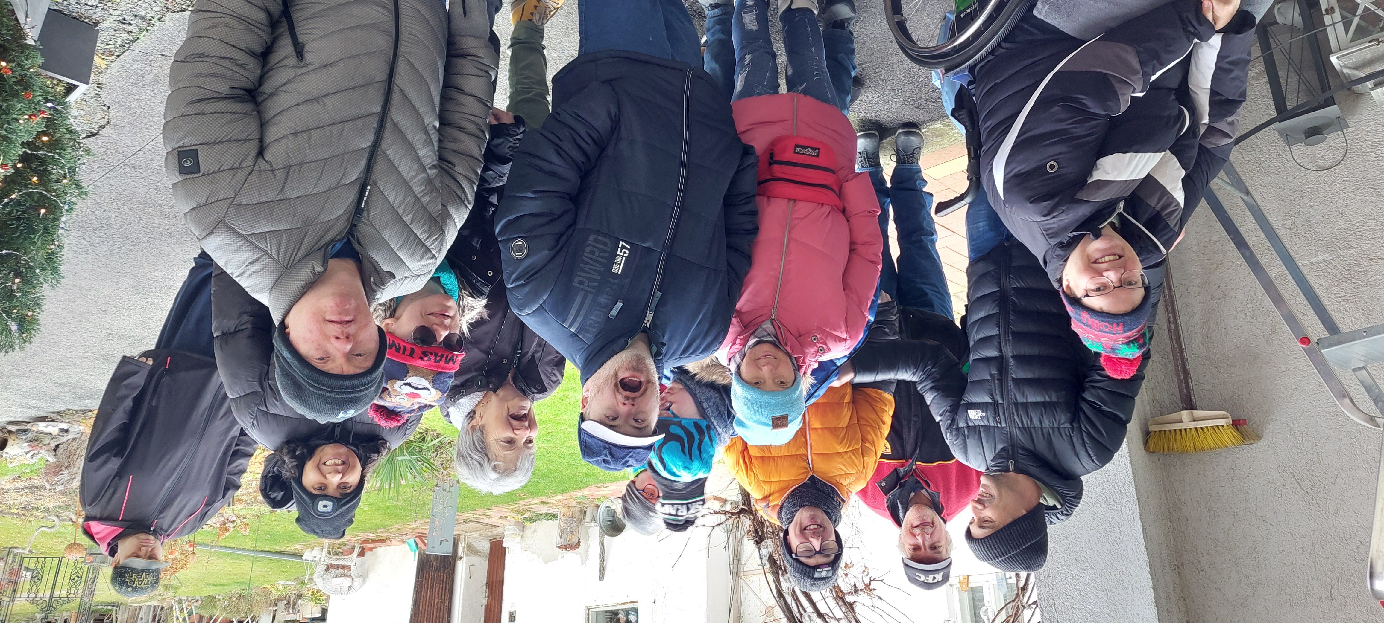 Anschließend besuchte die Gruppe Familie Weber, um sich mit einem kleinen Geschenk für die tollen Bastelutensilien, die an die Tagesstruktur Hirschstetten geschenkt wurden, zu bedanken. Natürlich durfte eine Jause mit selbstgebackenem Apfelkuchen und Säften nicht fehlen.