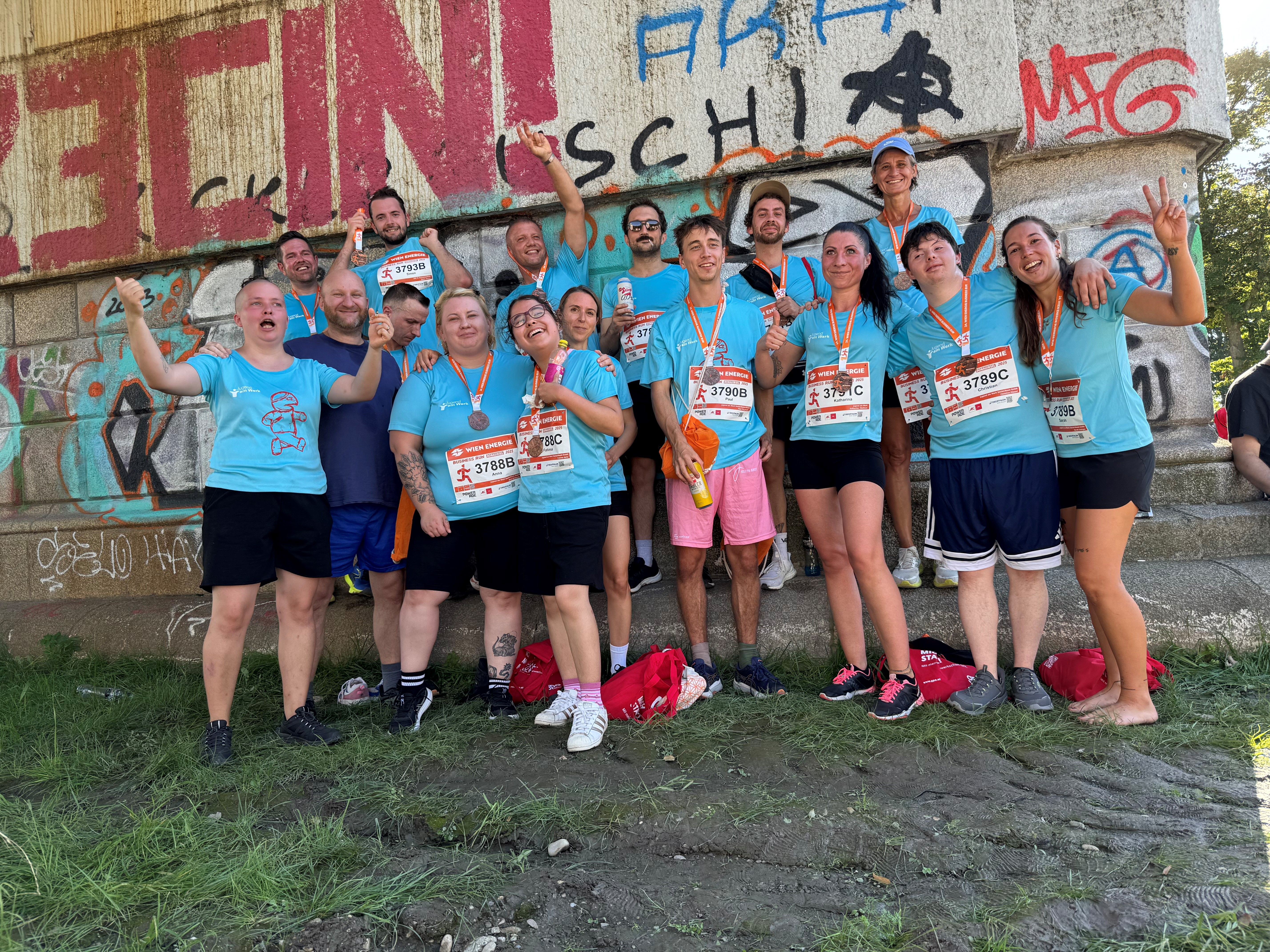 Gleich mehrere Teilnehmer:innen und Mitarbeiter:innen aus der Jugend am Werk Sozial:Raum GmbH nahmen beim Wien Energie Business Run 2025 am 4. September 2025 teil. Der rund 4,3 km lange Rundkurs der Laufstrecke führte auf der Donauinsel von der Floridsdorfer Brücke in Richtung Reichsbrücke und entlang der neuen Donau direkt am Wasser wieder retour zur Festwiese und musste von allen Teilnehmer:innen erfolgreich bewältigt werden. Wir gratulieren herzlich zu dieser tollen sportlichen Leistung!