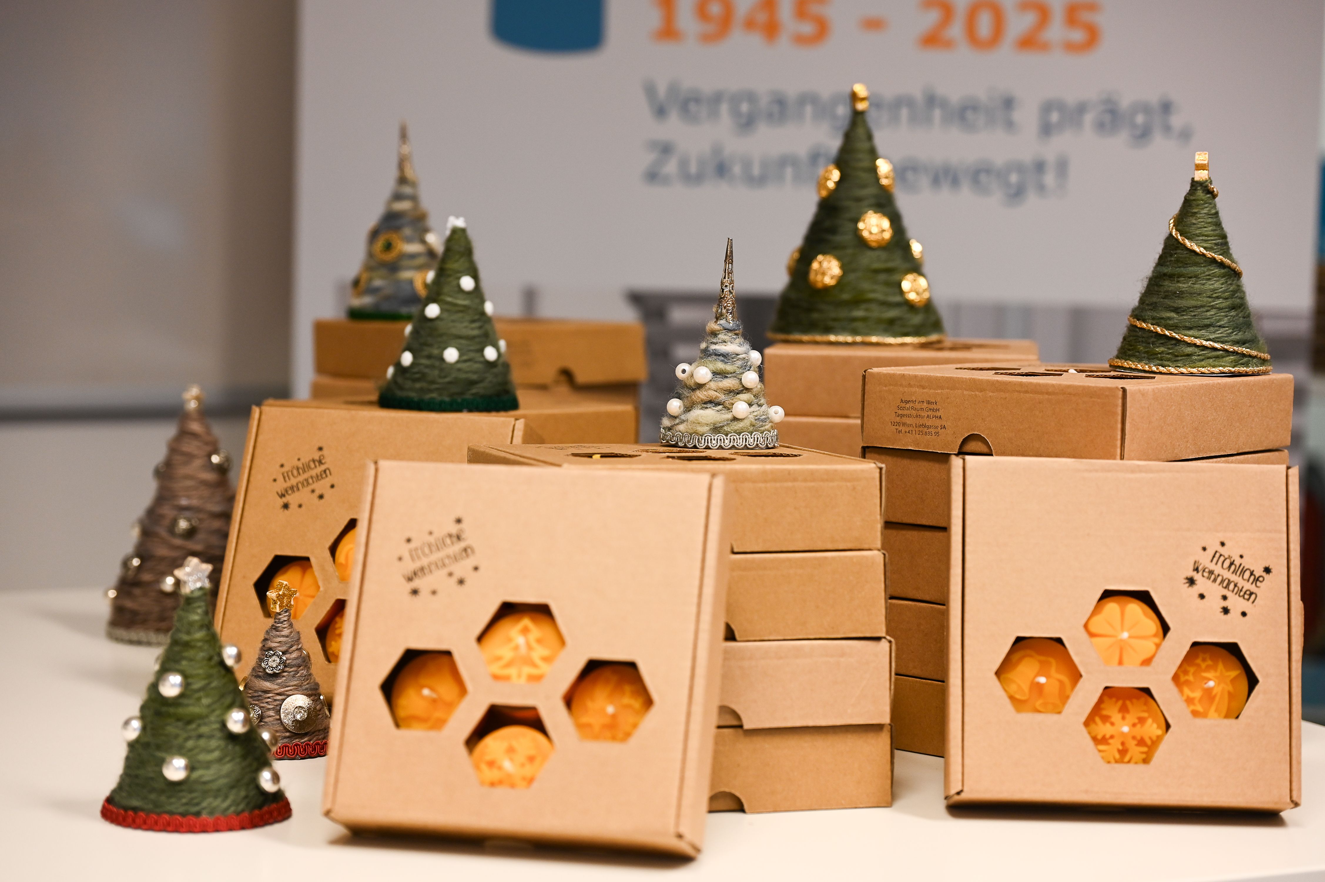 Die kreativen Weihnachtsbäume sind aus der Tagesstruktur Ayrenhoffgasse und die Weihnachtskerzen stammen aus der Tagesstruktur Alpha und sind aus Bienenwachs gefertigt.