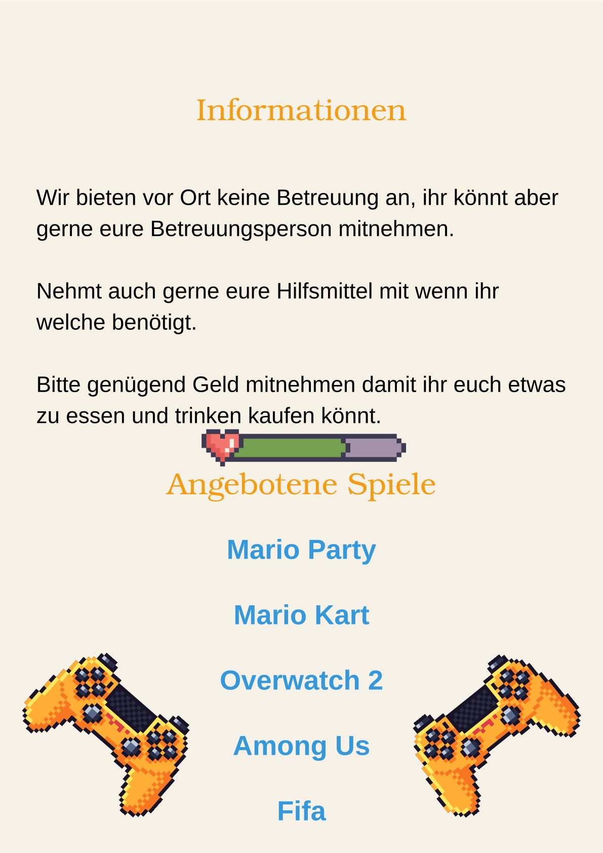 Wir bieten vor Ort keine Betreuung an, ihr könnt aber gerne eure Betreuungsperson mitnehmen. Nehmt auch gerne eure Hilfsmittel mit wenn ihr welche benötigt. Bitte genügend Geld mitnehmen damit ihr euch etwas zu essen und trinken kaufen könnt.
