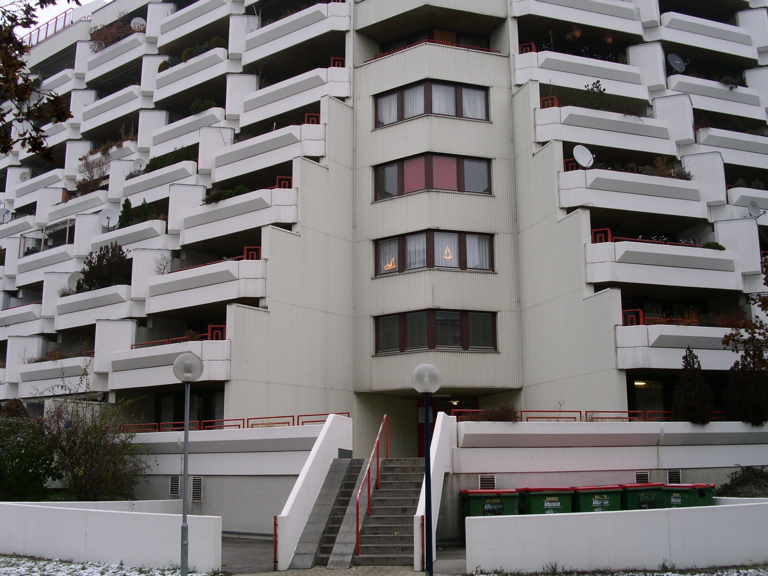 Am Dach der großen Wohnhausanlage befindet sich ein Schwimmbad für die Bewohnerinnen und Bewohner.
