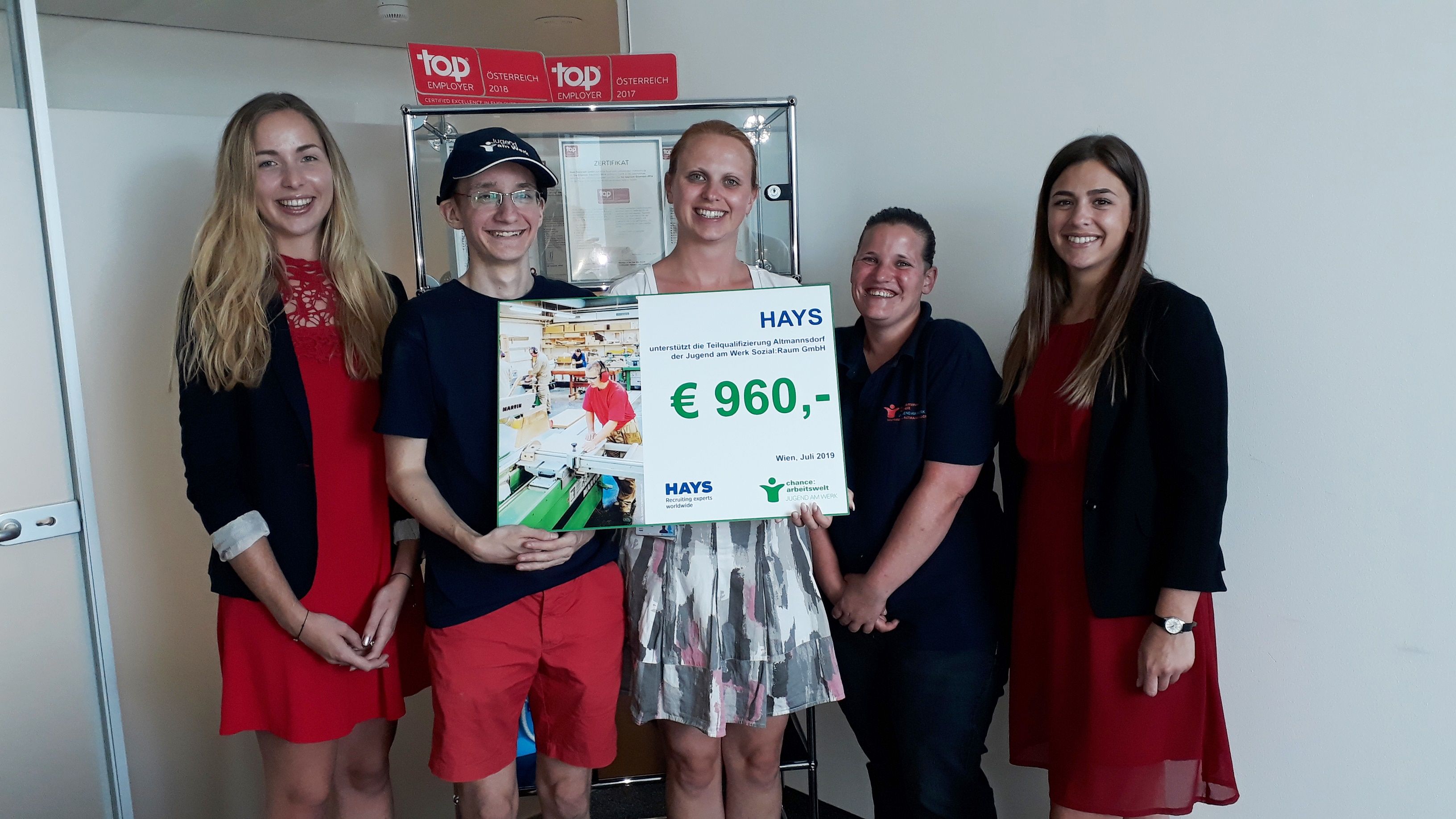 Am 3. Juli besuchte eine Delegation aus der Werkstätte und Tagesstruktur Altmannsdorf den Personaldienstleister Hays Österreich GmbH im 15. Bezirk und nahm dort eine Spende in der Höhe von 960,00 Euro für die Teilqualifizierung von Jugendlichen entgegen. In der Teilqualifizierung werden aktuell 20 Jugendliche in den Berufsfeldern Tischler/in, Maler/in und Beschichtungstechniker/in, Metallbearbeiter/in sowie Reinigungstechniker/in ausgebildet.